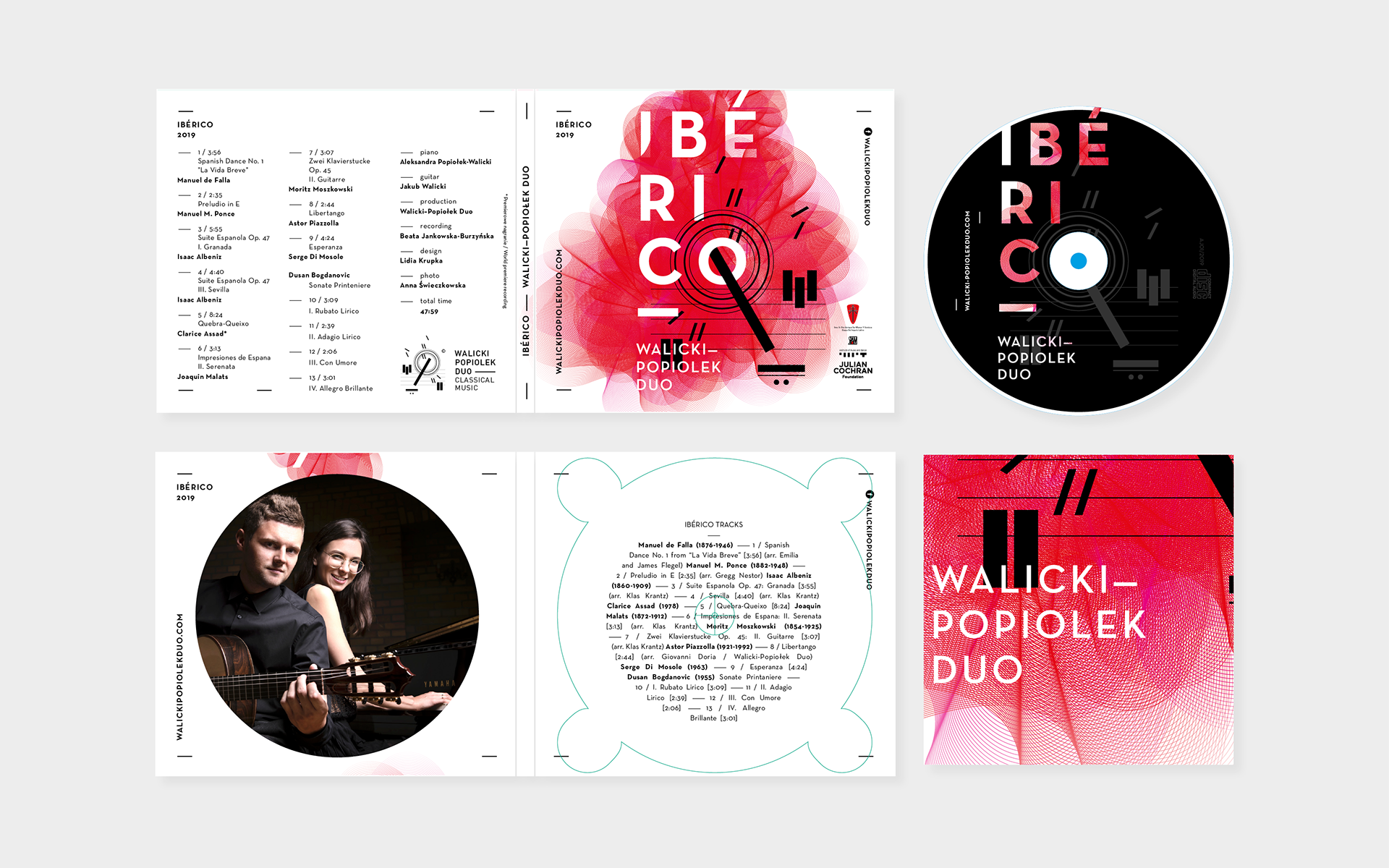 Iberico is the Walicki Popiolek Duo's debut album. The design mirrors the CD's romantic, dynamic music — evoking the swirling skirts of flamenco dancers.